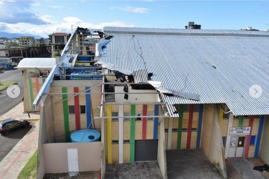 Em Capão da Canoa, o vento forte destelhou prédios, casas, escolas, praças e o Ginásio Municipal. A Defesa Civil está trabalhando junto com o Corpo de Bombeiros para ajudar as famílias atingidas.