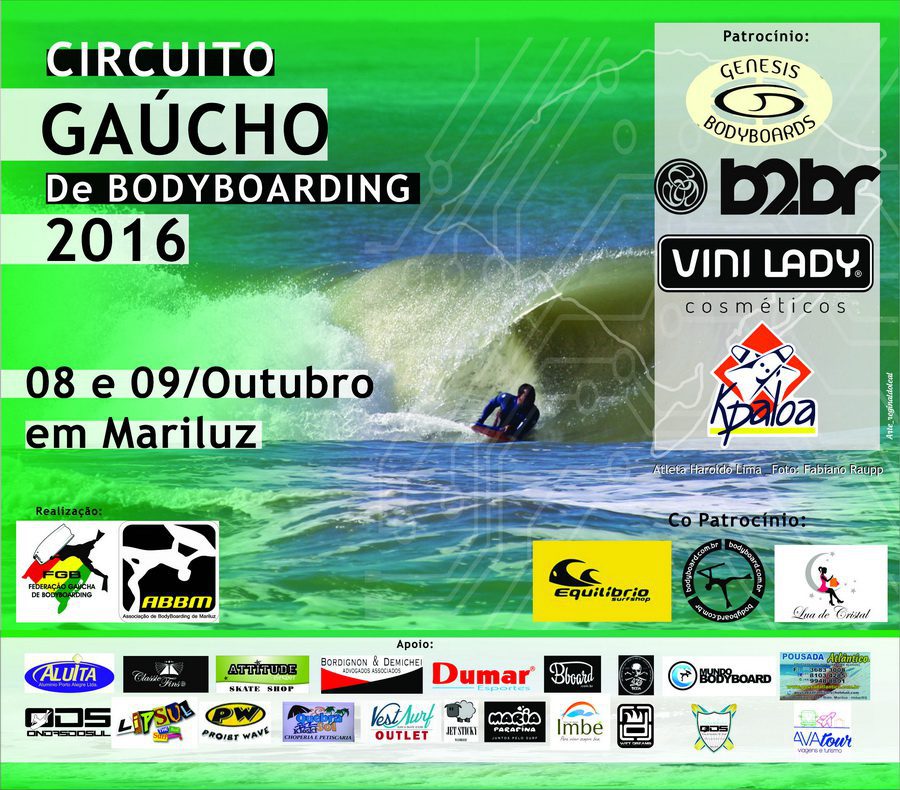 O Circuito Gaúcho de Bodyboard 2016 terá sua primeira etapa nos dias 8 e 9 de outubro, na praia de Mariluz, em Imbé. O evento será uma realização em conjunto da Federação Gaúcha de Bodyboarding (FGB) e da Associação de Bodyboarding de Mariluz (ABBM). As inscrições já estão abertas. Depois de oito anos sem ser realizado, o circuito volta com força.