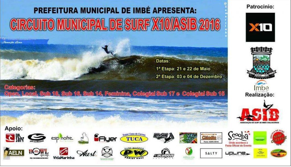 A Associação de Surf de Imbé e Balneários (ASIB) realizará o Circuito Municipal de Surf X10/ASIB 2016. Serão duas etapas, a primeira delas ocorrerá neste final de semana (dias 21 e 22 de maio). A Prefeitura de Imbé é uma das patrocinadoras e também apresentadora do evento, que ocorrerá junto a Guarita Central, no Calçadão (altura da Avenida Santa Rosa).