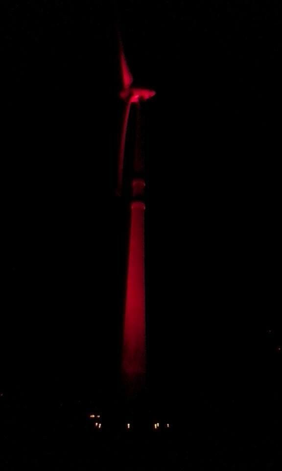 Neste mês um aerogerador está refletindo a cor vermelha, alusivo ao Maio Vermelho, que é o mês de combate e prevenção ao câncer bucal.