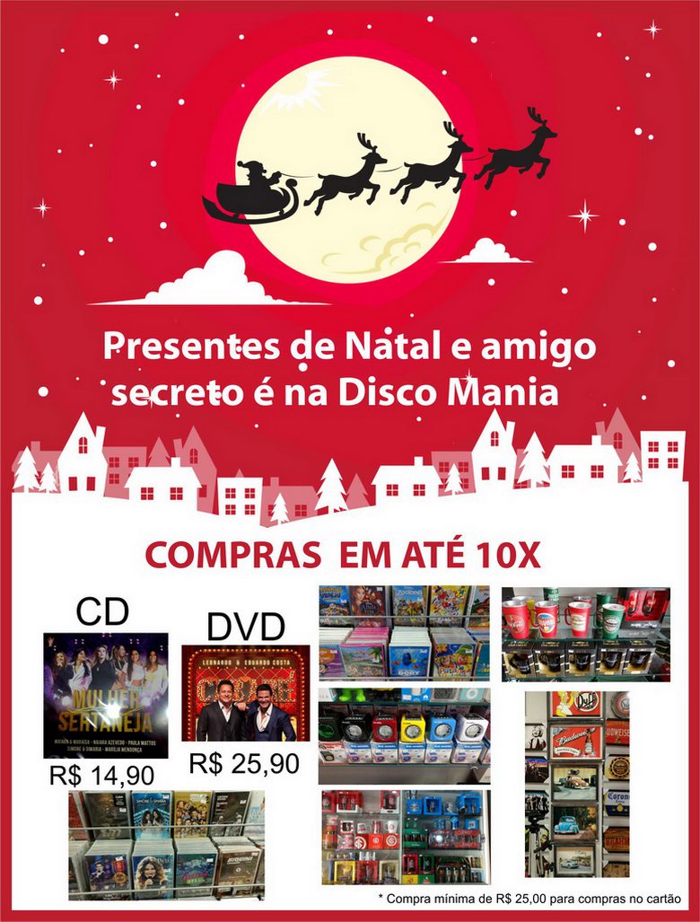 E para facilitar sua vida, na Disco Mania você pode realizar suas compras em até 10x. Isto mesmo, parcele suas compras de Natal e amigo secreto em até 10x. Games, pen drive temáticos, artigos da dupla Grenal, cds, dvds, instrumentos musicais, caixas de som em diversos formatos e muito mais, você encontra na loja.