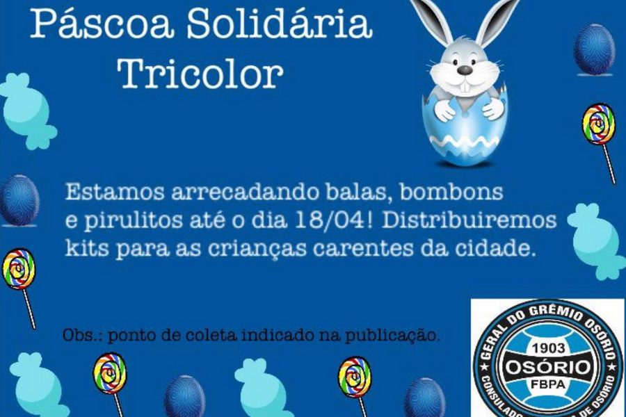 É a Páscoa solidária tricolor. Quem quiser colaborar, basta ir até a AS Celular, localizada na Rua Mal. Floriano Peixoto, 1076, no centro da cidade, até o dia 18/04.