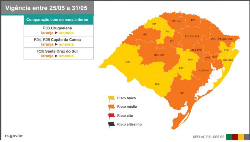 As regiões de Uruguaiana, Capão da Canoa (Litoral) e Santa Cruz do Sul passaram de laranja para amarela. Isso significa, na prática, que essas áreas passaram de risco avaliado como médio para baixo. As regras deste mapa serão válidas de 25 até 31 de maio.