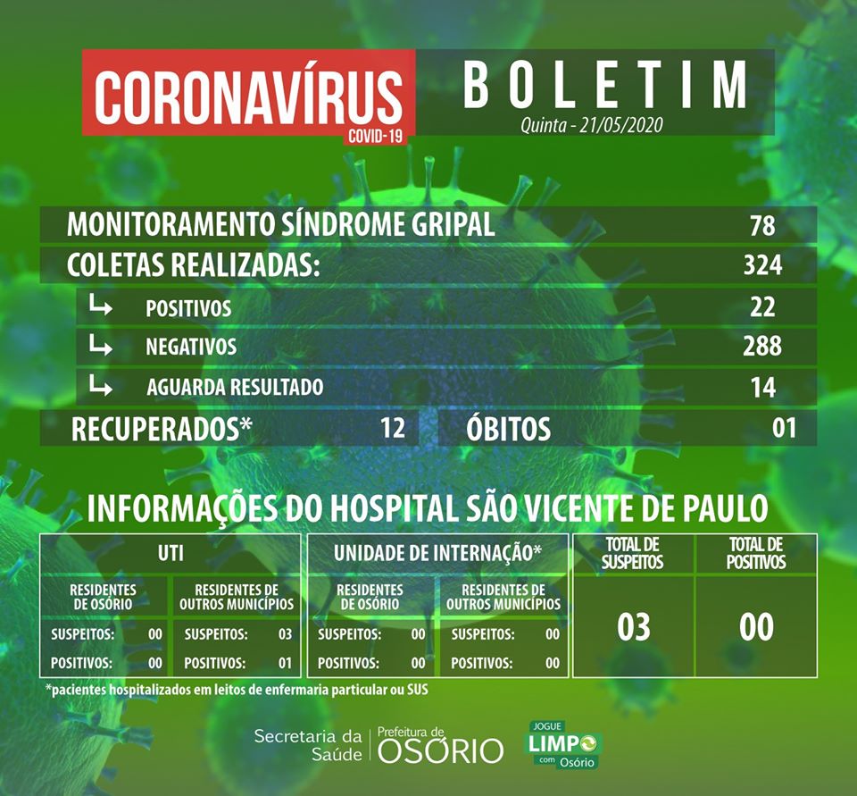Confira os números referentes a pandemia da Coronavírus COVID 19, em Osório, nesta quinta, 21/05/2020: