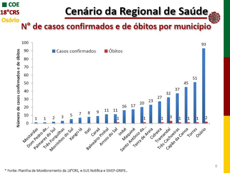 Osório tem 93 casos confirmados, Torres, 51, Capão da Canoa (45) Três Cachoeiras (37), Tramandaí (32), e Cidreira (27).