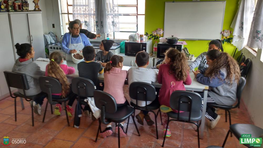 A oficina ocorre na cozinha onde já acontece a oficina para adultos com a parceria do Programa Jogue Limpo com Osório e a Secretaria Municipal de Assistência Social e Habitação.