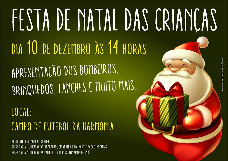 A Secretaria Municipal do Trabalho, Cidadania e Participação Popular, em parceria com a Secretaria Municipal da Mulher e Direitos Humanos, realizará no dia 10 de dezembro, no campo de futebol do Balneário Harmonia a Festa de Natal das Crianças, em Imbé.