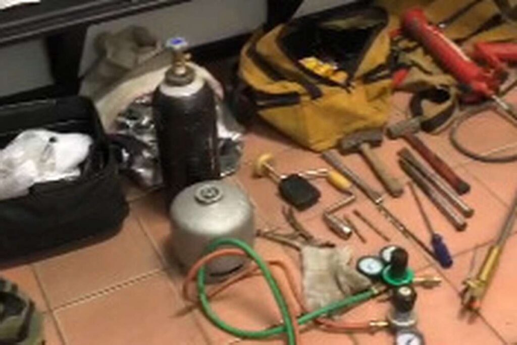 Com eles foram apreendidos um rádio comunicador na frequência da BM, cilindros de gás, pés de cabra, luvas, marretas, talhadeiras, furadeira, macacos hidráulicos, um desencarcerador, botijão de gás, maçarico, três automóveis, 11 telefones celulares e cerca de R$ 700,00.