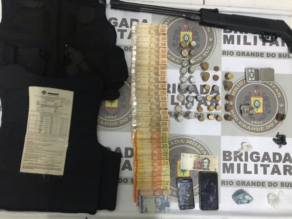 Foram apreendidos dinheiro, celulares, colete balístico, arma, maconha e cocaína.