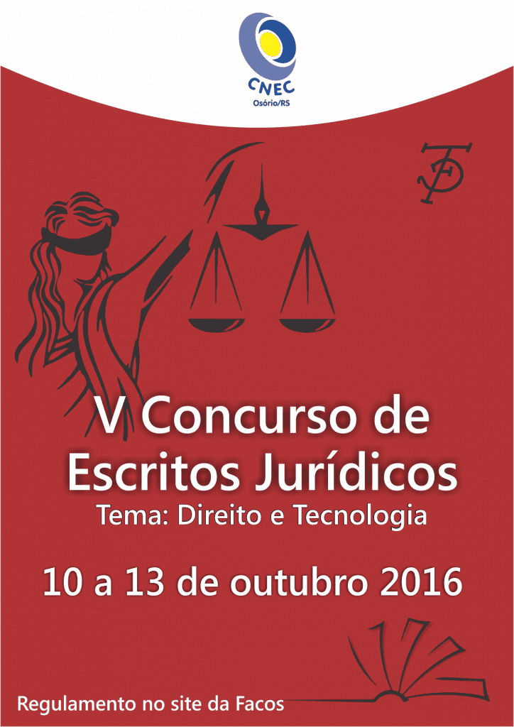 O tema do V Concurso de Escritos Jurídicos é Direito e Tecnologia, devendo os trabalhos abordarem o assuntos, seja de forma direta, seja de forma transversal. A modalidade de participação no V Concurso de Escritos Jurídicos constitui-se em pôster, com apresentação de paper, além da participação como ouvinte. Os trabalhos poderão ser apresentados na forma individual ou em grupos de, no máximo, 03 integrantes, além de 01 professor orientador, no máximo. As inscrições deverão ser efetivadas no site da CNEC Osório, de 15 de setembro a 05 de outubro de 2016.