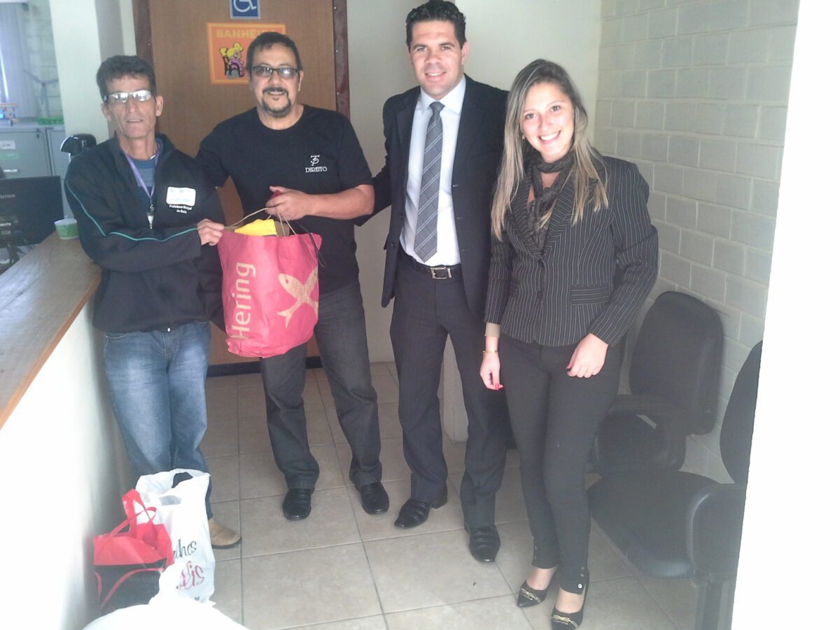 Estavam presentes no ato da entrega das doações o Professor Marcelo Terra Reis – Coordenador do Curso de Direito da FACOS; O Acadêmico do Curso de Direito – Albino Pinheiro de Oliveira – Integrante do Diretório Acadêmico e a Acadêmica do Curso de Direito – Bruna Jacobs Baptista – Integrante do Diretório Acadêmico.
