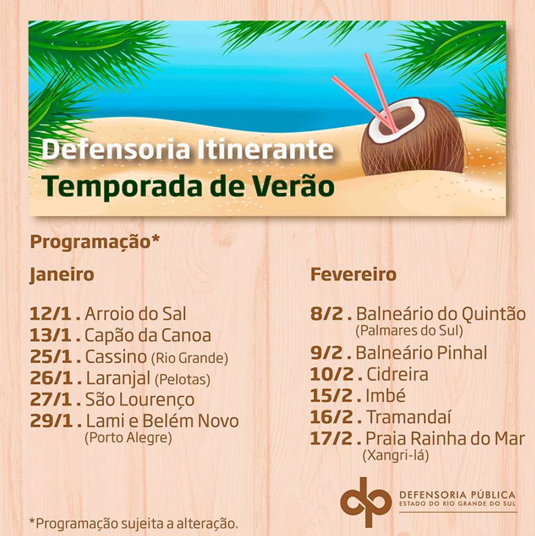 O Projeto Defensoria Itinerante – Temporada de Verão da Defensoria Pública do Rio Grande do Sul (DPE) tem previsão de início para esta quinta-feira (12), em Arroio do Sal, no Litoral Norte do Estado. Durante os meses de janeiro e de fevereiro a equipe da Defensoria Itinerante realizará 12 mutirões de atendimento, de orientação jurídica e de divulgação em praias do litoral norte, do litoral sul e do Guaíba, além da Lagoa dos Patos.