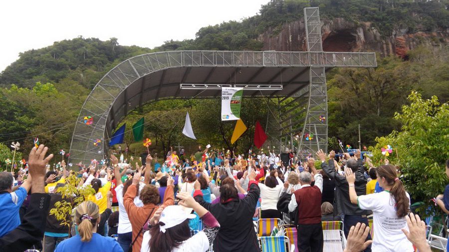As fortes chuvas que atingiram o Litoral Norte gaúcho nas últimas semanas deixavam muitos apreensivos, com dúvida sobre a possibilidade de mais chuva no sábado. O sol ficou encoberto pelas nuvens, mas o tempo colaborou para que o encontro fosse a céu aberto em meio a natureza linda do Santuário Nossa Senhora de Lourdes.