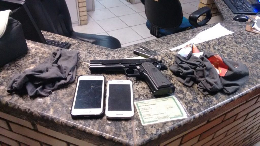 Com eles foi encontrada uma bolsa feminina com dois celulares. Um simulacro de pistola foi apreendido.