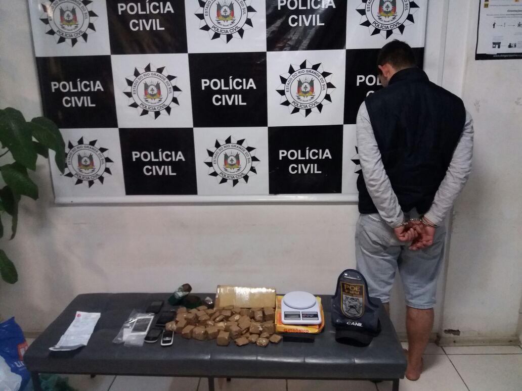 A ação resultou na apreensão de três quilos de maconha, fracionada em um tijolo grande e diversos tabletes, um carregador de pistola 9mm, uma balança de precisão, agenda com anotações de valores e diversos aparelhos celulares. Dois homens foram presos temporariamente por tráfico de drogas.