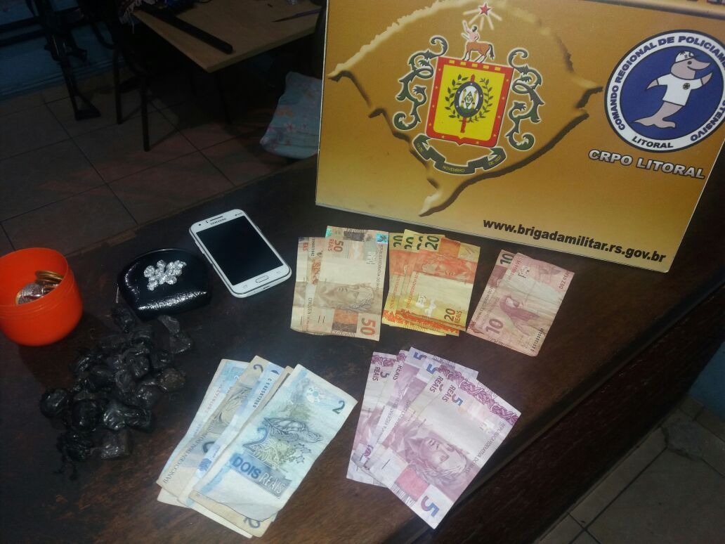 Com eles foram localizadas 11 pedras de crack, 20 tijolinhos de maconha e R$ 290,00.