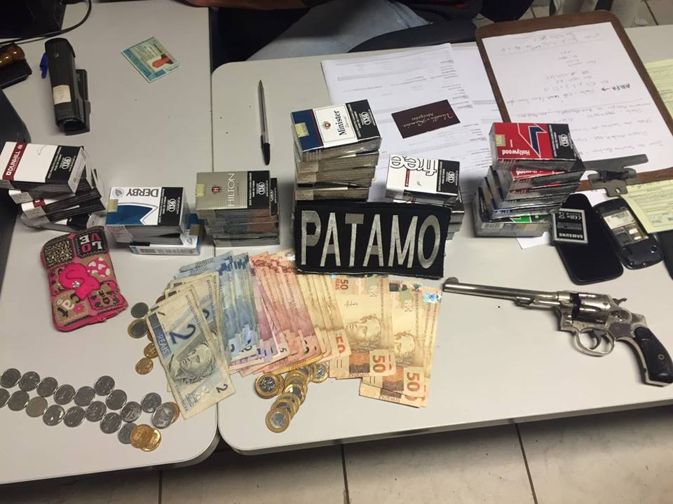 Com eles foi localizada uma mochila com os produtos do roubo e um revólver calibre 32 com três cartuchos deflagrados e dois intactos. A moto estava com numeração raspada no chassi e motor.
