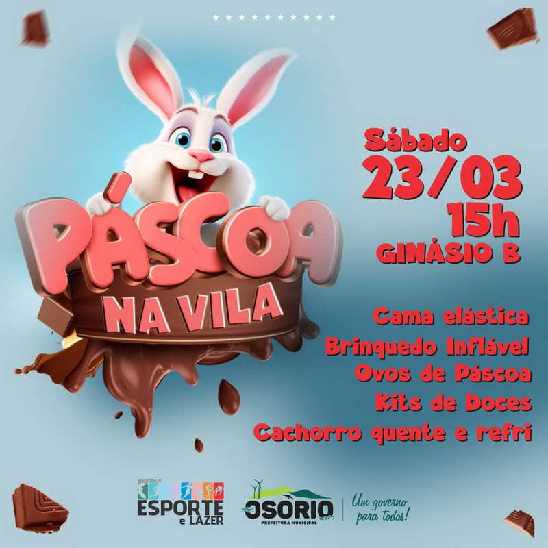 Neste sábado, dia 23, a partir das 15h, a Prefeitura Municipal de Osório realizará o evento Páscoa na Vila, no ginásio B da Vila Olímpica.