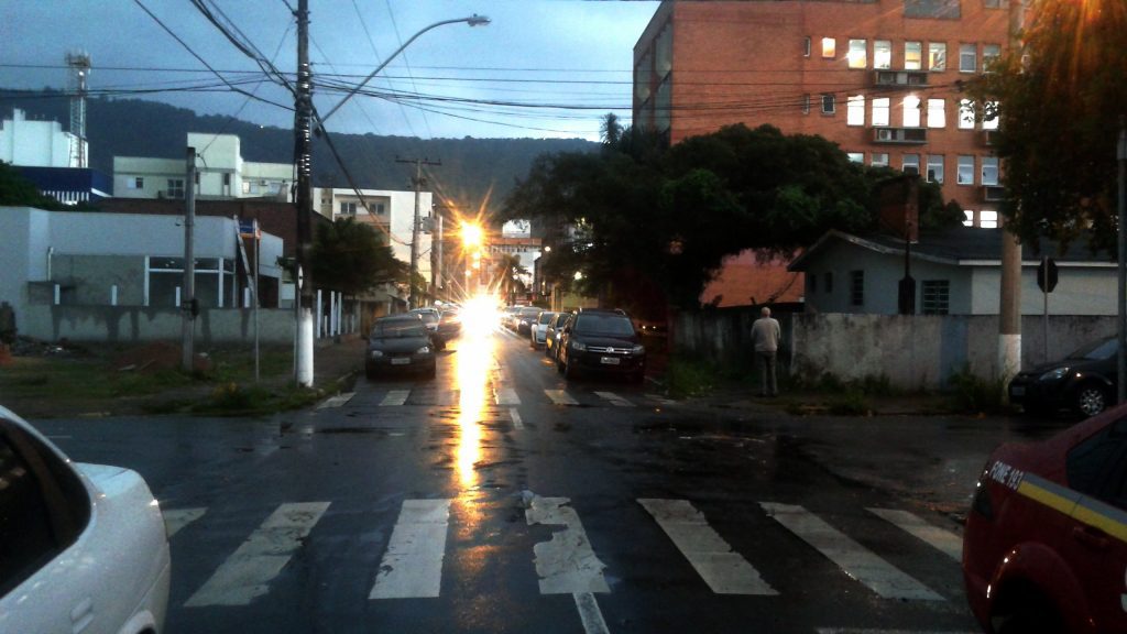 Carros com faróis acesso, lâmpadas de postes ligadas e pouca luminosidade deram o tom de parte da manhã.