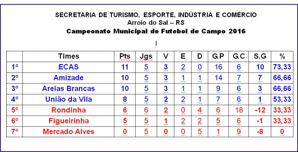A 6ª rodada do Campeonato Municipal de Futebol de Campo 2016 de Arroio do Sal teve como destaque a equipe do Esporte Clube Arroio do Sal (ECAS) que venceu por 6 a 2 a Rondinha, em partida disputada, no último domingo (5), no estádio Elza dos Santos.