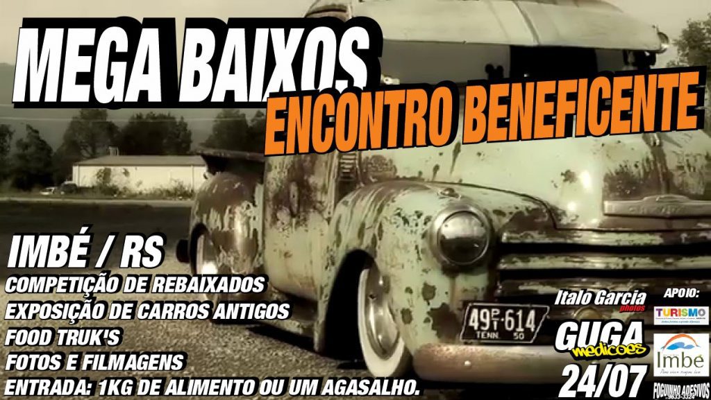Ocorre no próximo domingo (24), na Avenida Rio Grande, no Centro de Imbé, o Encontro Beneficente Mega Baixos. O evento conta com apoio da Secretaria Municipal de Turismo, Desporto, Indústria e Comércio de Imbé.