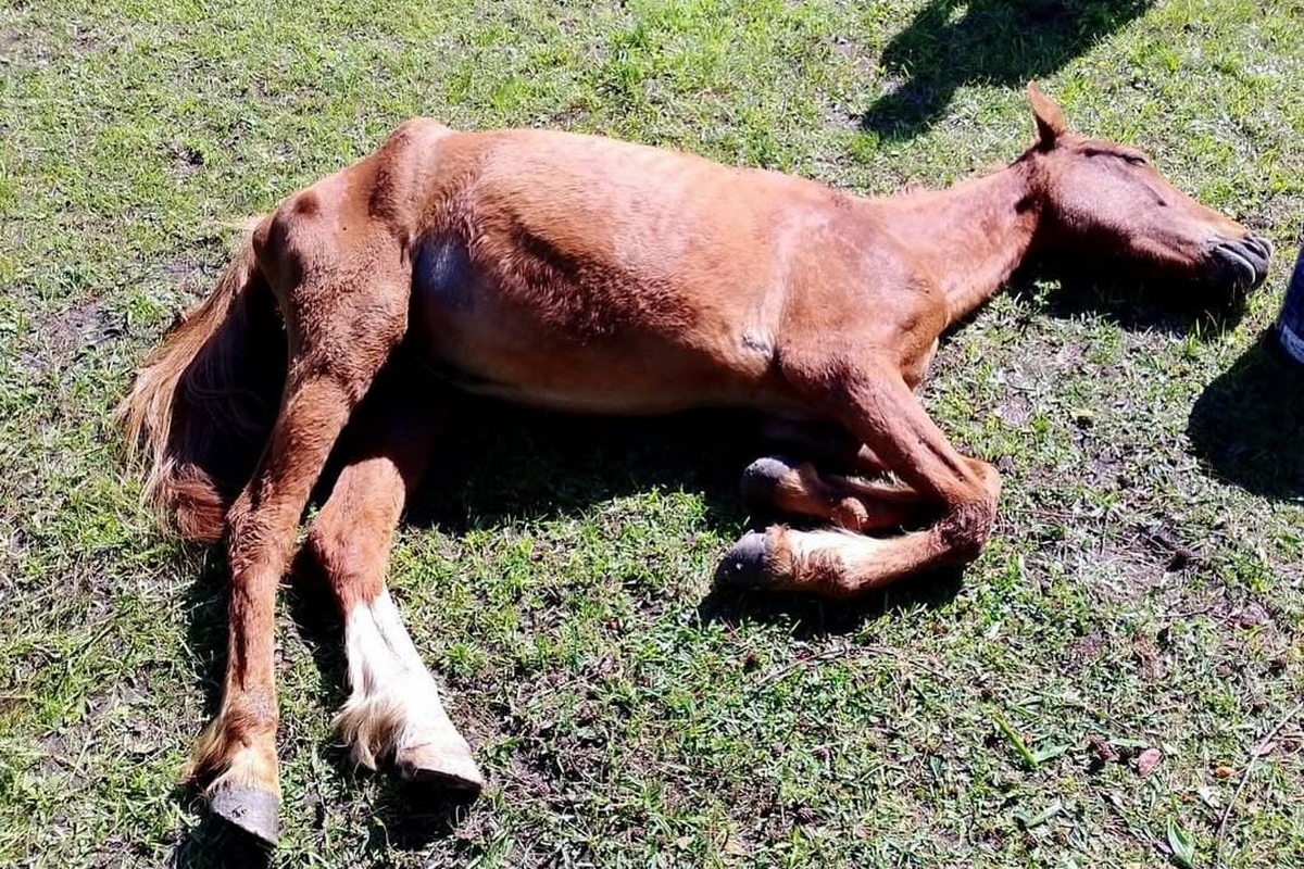 Uma égua foi encontrada em situação crítica no distrito de Atlântida Sul, exigindo ação imediata do Departamento de Proteção Animal (DEPA) e da Patrulha Ambiental (Patram).