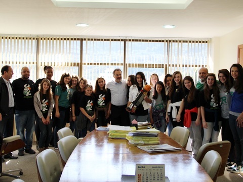 As meninas da equipe entregaram uma medalha para o prefeito, homenageando-o pelos incentivos municipais ao esporte e à equipe.