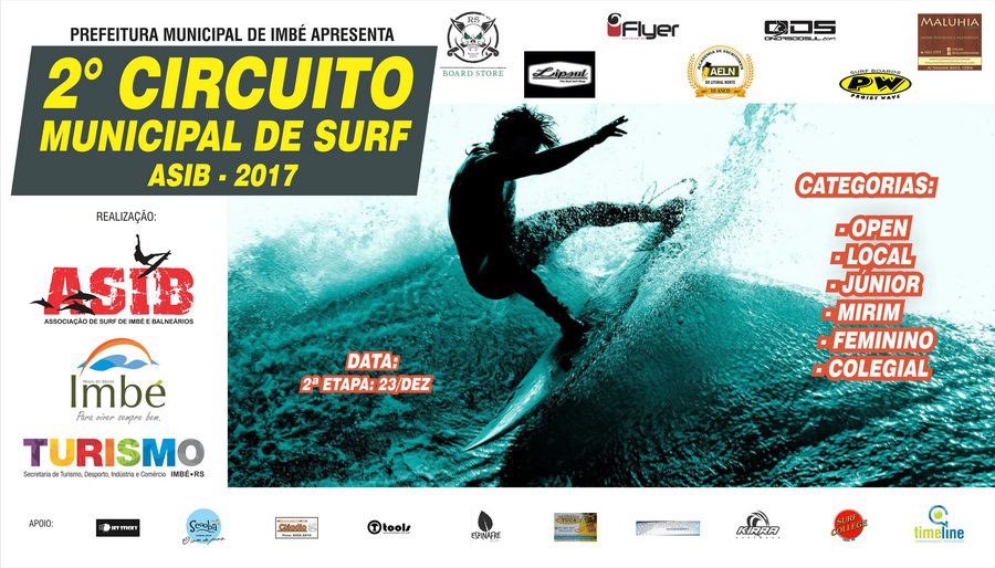 A Associação de Surf de Imbé e Balneários (ASIB) realizará a segunda e última etapa do Circuito Municipal de Surf, no dia 23 de dezembro, junto a Escola Surf College, no calçadão da Avenida Beira Mar de Imbé. O evento é apresentado pela Prefeitura Municipal e contará com seis categorias: Open, Local, Júnior, Mirim, Feminino e Colegial.