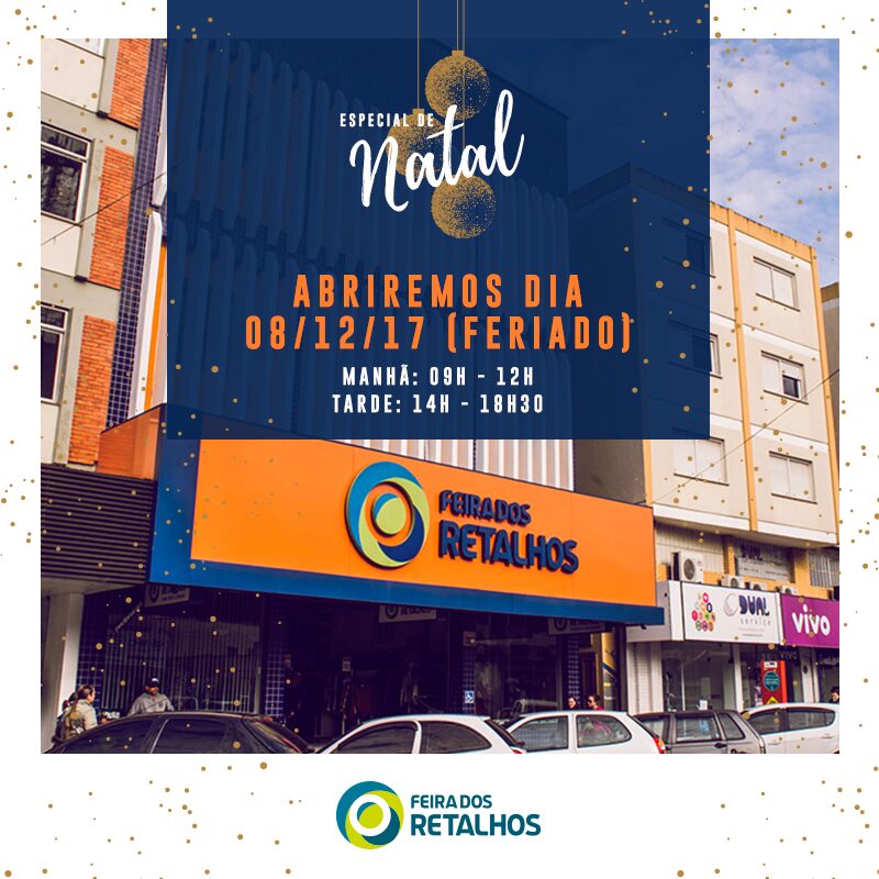 A loja Feira dos Retalhos está aberta nesta sexta-feira (08), feriado em Osório. O horário será das 9h às 12h. 14h às 18h30min. Antecipe suas compras de Natal e amigo secreto.
