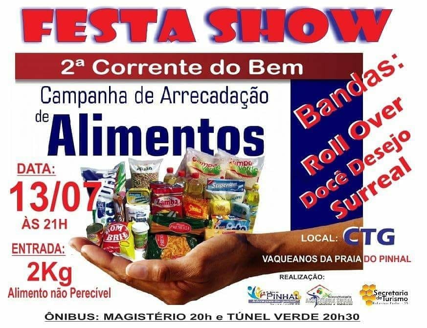 A Prefeitura de Balneário Pinhal, por meio da Secretaria de Assistência Social, Cidadania e Habitação, com apoio da Secretaria de Turismo irá realizar na sexta-feira (13/07) às 21h no CTG Vaqueanos da Praia do Pinhal, mais uma edição do Festa Show (2ª Corrente do Bem).