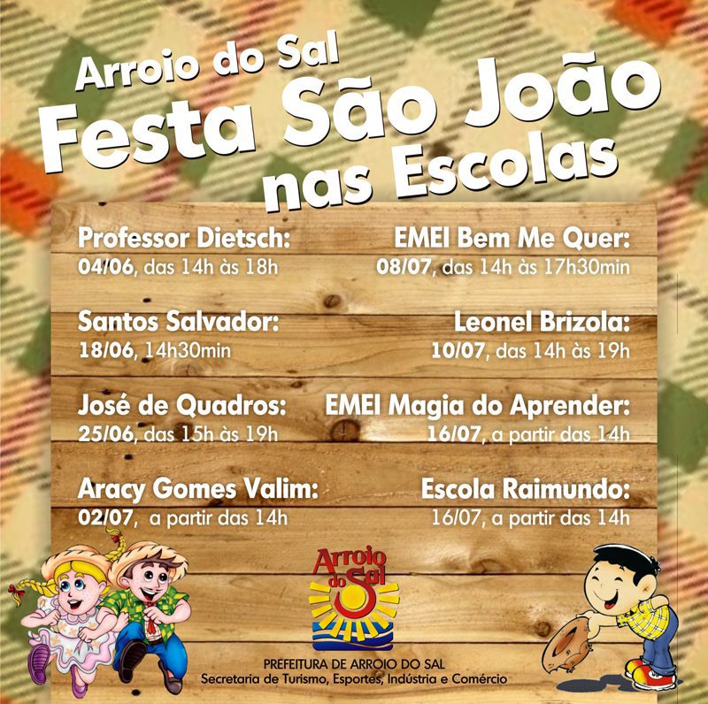 Dia 4/06: E.E.E.F Professor Dietschi (Das 14h às 18h) – Rondinha Nova Dia 18/06: E.M.E.F Santos Salvador de Mello (A partir das 14h) – balneário Atlântico Dia 25/06: E.E.E.M José de Quadros (Das 15h às 19h) – Centro Dia 2/07: E.M.E.F Aracy Gomes Valim (A partir das 14h) – Balneário Jardim Raiante Dia 8/07: E.M.E.I. Bem-Me-Quer (Das 14 às 17h30) – Centro Dia 10/07: E.M.E.F Governador Leonel Brizola (Das 14h às 19h) – Bairro Quatro Lagos Dia 16/07: E.M.E.I. Magia do Aprender (A partir das 14h) – Bairro Novo Arroio do Sal Dia 16/07: E.M.E.F. Raimundo Fernandes de Oliveira (A partir das 14h) – Balneário Areias Brancas