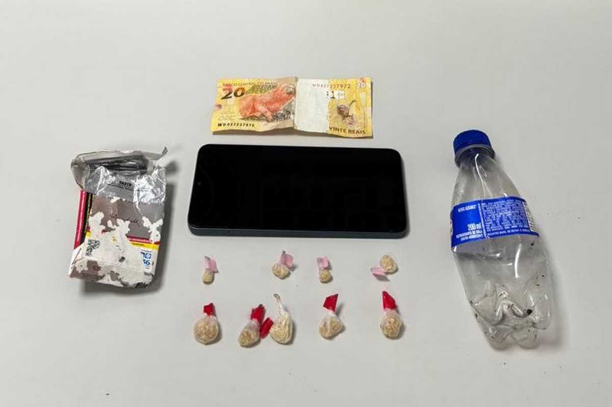 Na abordagem, um deles — de 27 anos e monitorado por tornozeleira eletrônica — foi flagrado com oito porções de crack, um celular e R$ 20.