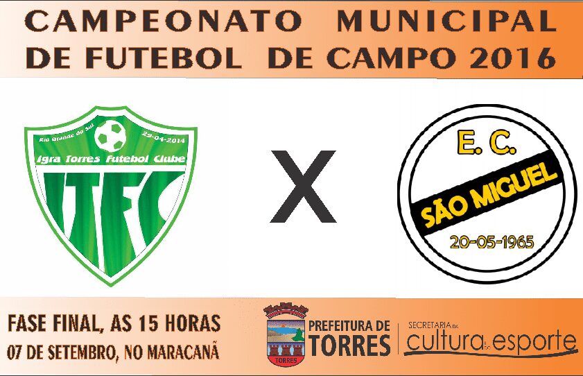 A final do Campeonato Municipal de Futebol de Campo 2016 será realizada no próximo dia 7 de setembro, quarta-feira, feriado comemorativo a data de Independência do Brasil. EC São Miguel e o Igra Torres FC são os times finalistas.