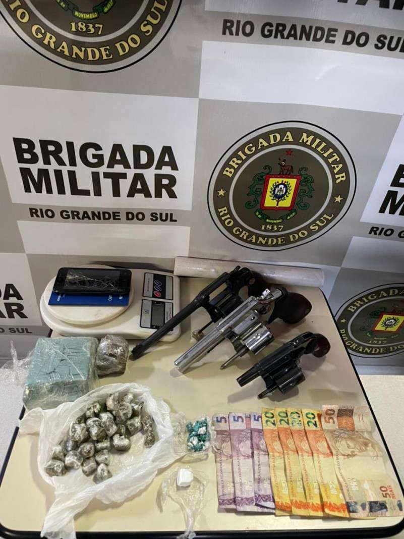 Durante revista aos homens foram localizados três revólveres calibre .38, 12 munições do mesmo calibre, dois tijolos de maconha, 32 porções da mesma droga, 21 porções de cocaína, um celular, uma balança de precisão e R$ 145.