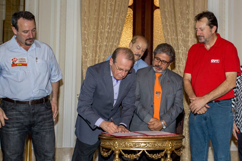 O governador Tarso Genro sancionou, na manhã desta sexta-feira (19), o projeto de reajuste de 16% do salário mínimo regional, de autoria do Executivo gaúcho. Dezenas de trabalhadores e de centrais sindicais compareceram ao ato, no Palácio Piratini.