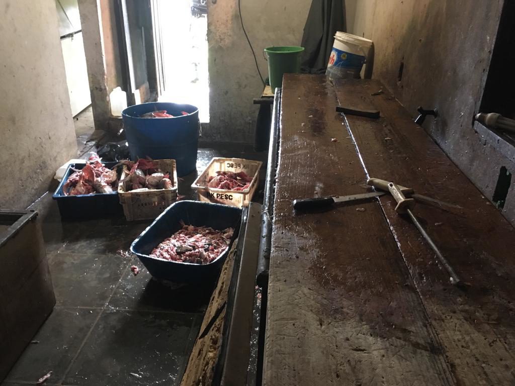 A peça utilizada para o beneficiamento do pescado, encontrava-se sujo de vísceras, repleto de moscas e exalando forte cheiro dos resíduos em decomposição. Assim como a água utilizada no processo era captada do rio através de uma bomba.