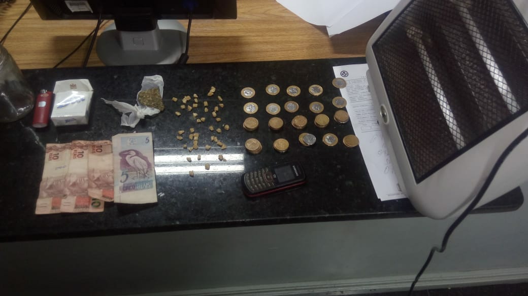 Com ele foi localizada uma carteira de cigarro contendo 45 pedras de crack, um torrão de maconha, R$ 35 em dinheiro e mais R$ 19,50 em moedas.