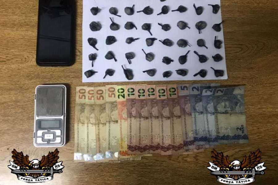 Realizada a abordagem, sendo localizados em busca pessoal, 48 porções de cocaína, uma balança de precisão e R$ 281.