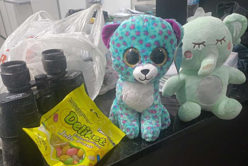 Durante a abordagem, o homem demonstrou estar visivelmente alterado. Com ele, foram encontrados itens suspeitos como ursos de pelúcia, binóculos e doces, que, segundo os agentes, poderiam ser utilizados para atrair as crianças.