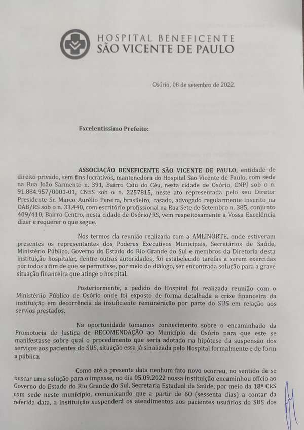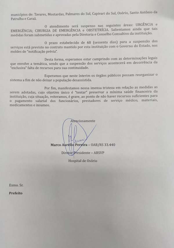 A decisão foi divulgada através de um documento (ver abaixo), assinado pelo diretor-presidente da instituição, Marco Aurélio Pereira, e encaminhado aos prefeitos da região na qual a unidade é referência no atendimento.