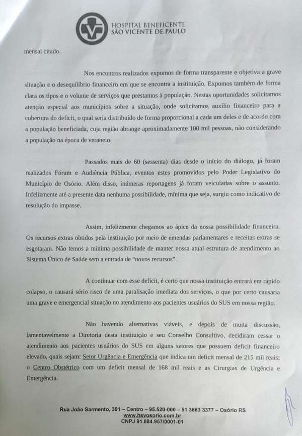 Na nota, Pereira deixa claro que a Casa de Saúde chegou ao limite da capacidade financeira. “Pela total incapacidade financeira, desequilíbrio, que impossibilita manter estes serviços.