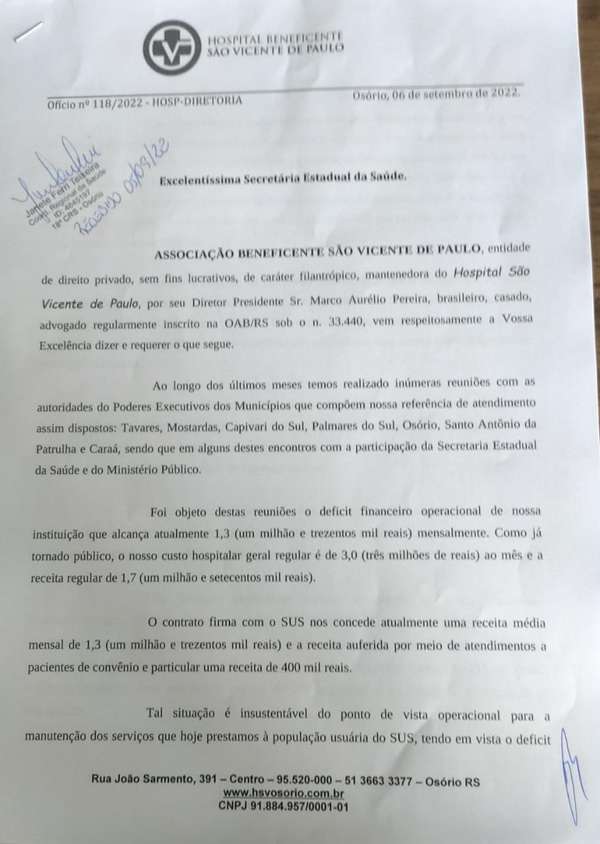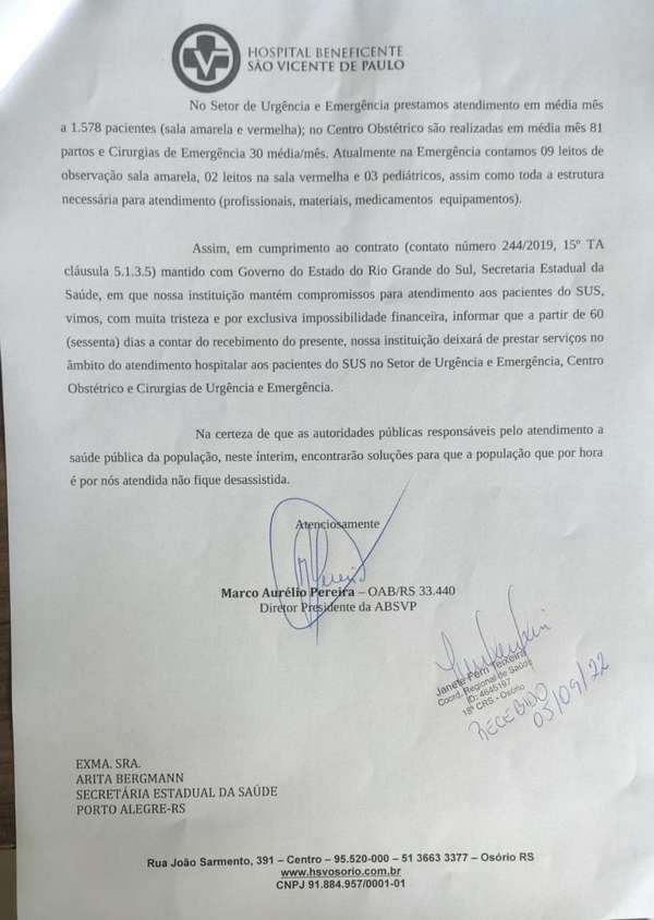 O hospital de Osório deve deixar de atender pacientes pelo Sistema Único de Saúde (SUS) a partir do dia 7 de novembro.