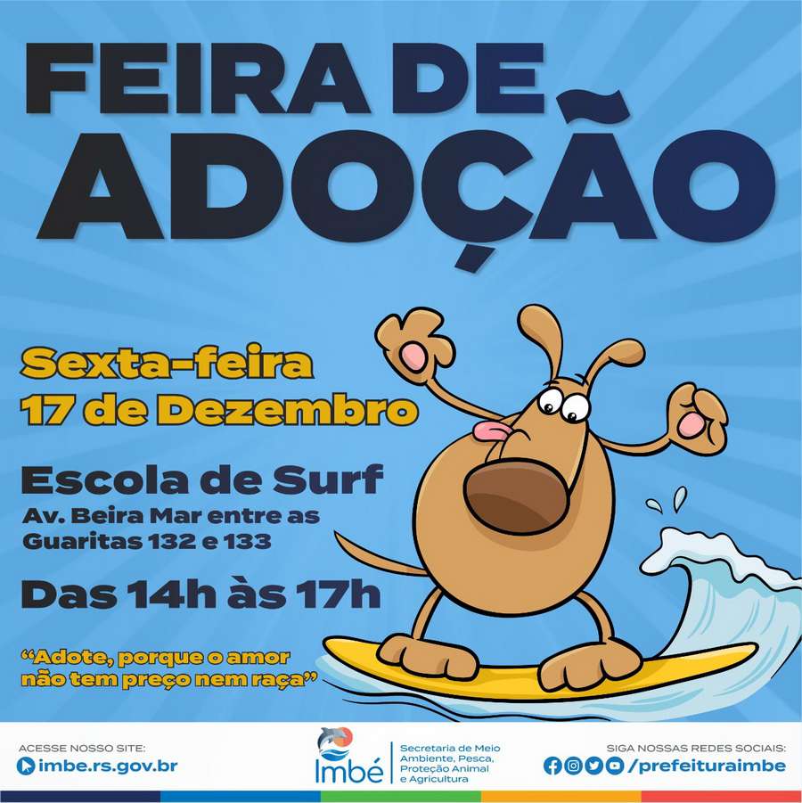 Imbé realizará mais uma edição da feira de adoção de animais, nesta sexta-feira (17). O evento acontece na escola de Surf, localizada na avenida Beira Mar, entre as guaritas 132 e 133, das 14h às 17h.
