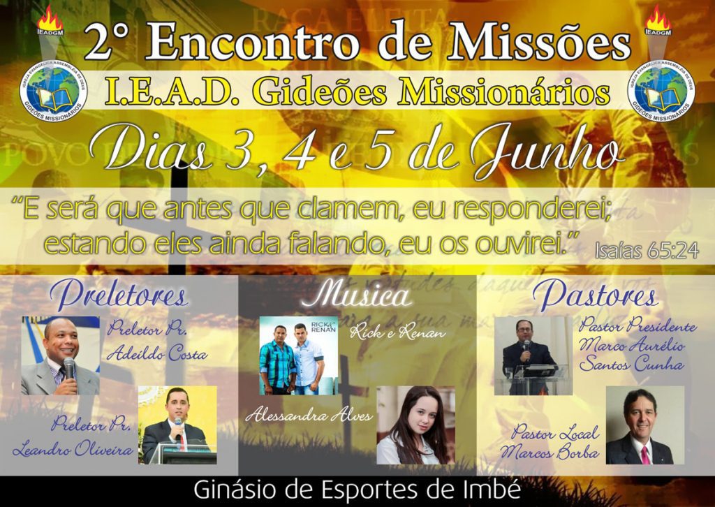 O Ginásio Municipal Engenheiro Floreal Sala sediará, nos dias 3, 4 e 5 de junho o 2º Encontro de Missões, realizado pela Igreja Evangélica Assembleia de Deus Gideões Missionários.