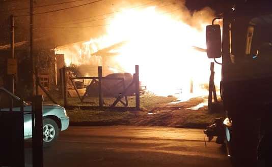 Na madrugada deste sábado (13), um incêndio de grandes proporções consumiu completamente uma casa de madeira e dois veículos no bairro Caravagio, em Osório.