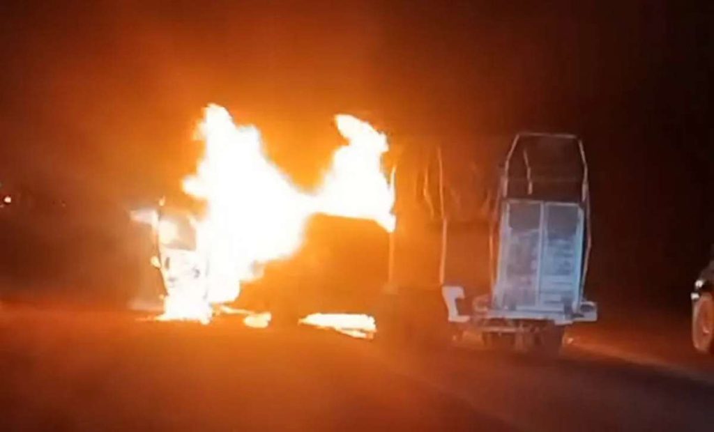 O carro, que rebocava um trailer para transporte de cavalo, foi rapidamente tomado pelas chamas.