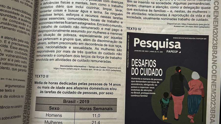 A imagem reproduzida na internet mostra a página 19 do caderno de provas do tipo 3, branco. Na fotografia, há o tema da redação: “Desafios para o enfrentamento da invisibilidade do trabalho de cuidado realizado pela mulher no Brasil”, bem como instruções aos candidatos para redigirem a dissertação, como número de linhas da folha, uso de caneta preta e penalidade com nota zero quando houver fuga do tema proposto. A imagem mostra ainda quatro textos de apoio relacionados ao tema proposto.