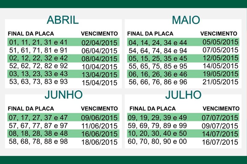 Encerrado o prazo de pagamento antecipado do IPVA 2015, o motorista gaúcho precisa agora ficar atento para o final das placas do seu veículo, que define a data limite para transitar com o licenciamento antigo. O calendário entre os meses de abril e julho se inicia já nesta quinta-feira (2) para as placas com final 01, 11, 21, 31 e 41. Já na próxima segunda-feira (6) é o prazo para veículos com numeração que encerra em 51, 61, 71, 81 e 91 (veja aqui calendário completo).