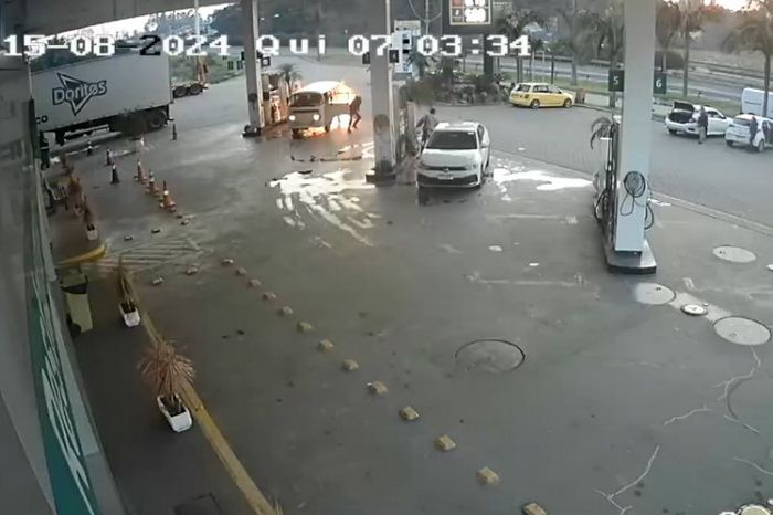 Uma câmera de vigilância flagrou o momento exato em que as chamas consumiram a Kombi.