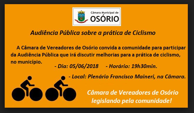 Legislativo discutirá melhorias para a prática de ciclismo em Osório 10A Câmara de Vereadores de Osório, por meio do requerimento do Vereador Roger Caputi, realiza nesta terça-feira, dia 05 de junho, às 19h30min. uma Audiência Pública que irá discutir melhorias para a prática de ciclismo no município.